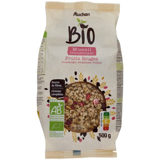 Ingrédients : Flocons d'AVOINE complets* 40%, sucre de canne*, billettes de céréales* 8,7% (riz* 6,8%, BLÉ complet* 0,8%, AVOINE complète* 0,5%, sucre de canne*, sel), huile de tournesol*, sirop de riz*, canneberges sucrées séchées* (canneberges* 2,9%, sucre de canne*, huile de tournesol*), flocons de BLÉ complets* 4%, flocons de SEIGLE complets* 4%, flocons d'ORGE complets* 4%, farine de BLÉ* 3,5%, pétales de maïs*, noix de coco séchée*, AMANDES toastées* 2,4%, miel*, framboises lyophilisées* 1%, fraises lyophilisées* 1%. *biologique. Traces éventuelles de fruits à coque, de soja, de lait, de graines de sésame, d'arachides..