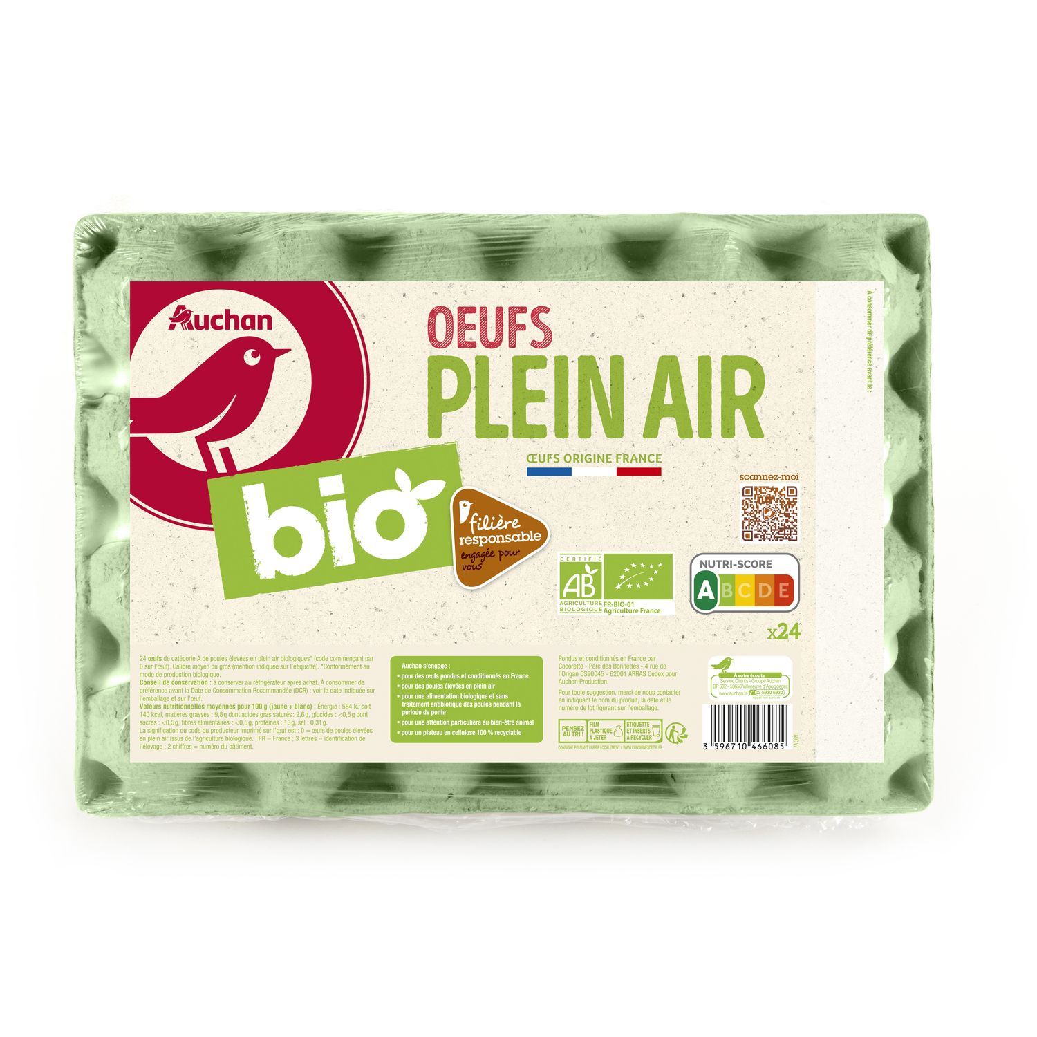 24 œufs de catégorie A de poules élevées en plein air biologiques* (code commençant par 0 sur l’œuf), calibre Moyen ou Gros. * Conformément au mode de production biologique. Des engagements pour les animaux et l’environnement: Riche en antioxydants, en fer et en vitamines, parfait en terme d’apports en protéines... L’œuf est un aliment plein de qualités ! Mais aujourd’hui les consommateurs exigent aussi des garanties sur les conditions d’élevage des poules. C’est pourquoi l’œuf bio se retrouve naturellement dans les rayons d’Auchan. Comment se distingue t-il des autres ? Pondu et conditionné en France, il est d’abord synonyme de respect des animaux. Les poules pondeuses ont ainsi accès à un parcours couvert de végétation, alors que pour le « plein air » tout court le terrain peut être nu. La nuit elles sont abritées à six, maximum, par mètre carré. Et leur alimentation est évidemment biologique, à 95% minimum, sans traitement antibiotique. L’œuf bio est également produit dans le respect de l’environnement. Dans les fermes, les déchets sont, en effet, triés, et les eaux de nettoyage récupérées pour l’arrosage des terres. Quant aux boites et étiquettes, elles sont 100 % recyclées et recyclables. L’impact sur l’environnement est également limité en ce qui concerne le transport, car moins de 300 kilomètres séparent le lieu de ponte et le centre de conditionnement. Ce qui garantit aussi aux amateurs un œuf bien frais ! Pour les producteurs de cet œuf bio aussi, les engagements de la filière responsable ont de nombreux effets positifs : d’abord au niveau économique, le prix payé aux éleveurs tient compte du coût de l’aliment des poules, ce qui leur garantit un niveau de revenu stable. Les fournisseurs d’aliments étant, quant à eux, sélectionnés à proximité des régions de production. Enfin, gage de confiance, le contrat qui lie le producteur et le conditionneur est de 10 ans, ce qui donne aux éleveurs une grande sécurité de débouchés. Sur le plan humain pour finir, l’œuf bio a de nombreuses vertus : partenaire d’Auchan, Cocorette, entreprise créée en 1983, soutient le développement de la Filière à travers un accompagnement qui favorise les nouvelles installations. Des fermes françaises, à taille humaine, et engagées dans un mode de production biologique. Toutes les conditions sont ainsi réunies pour faire cet œuf un aliment indispensable au quotidien.