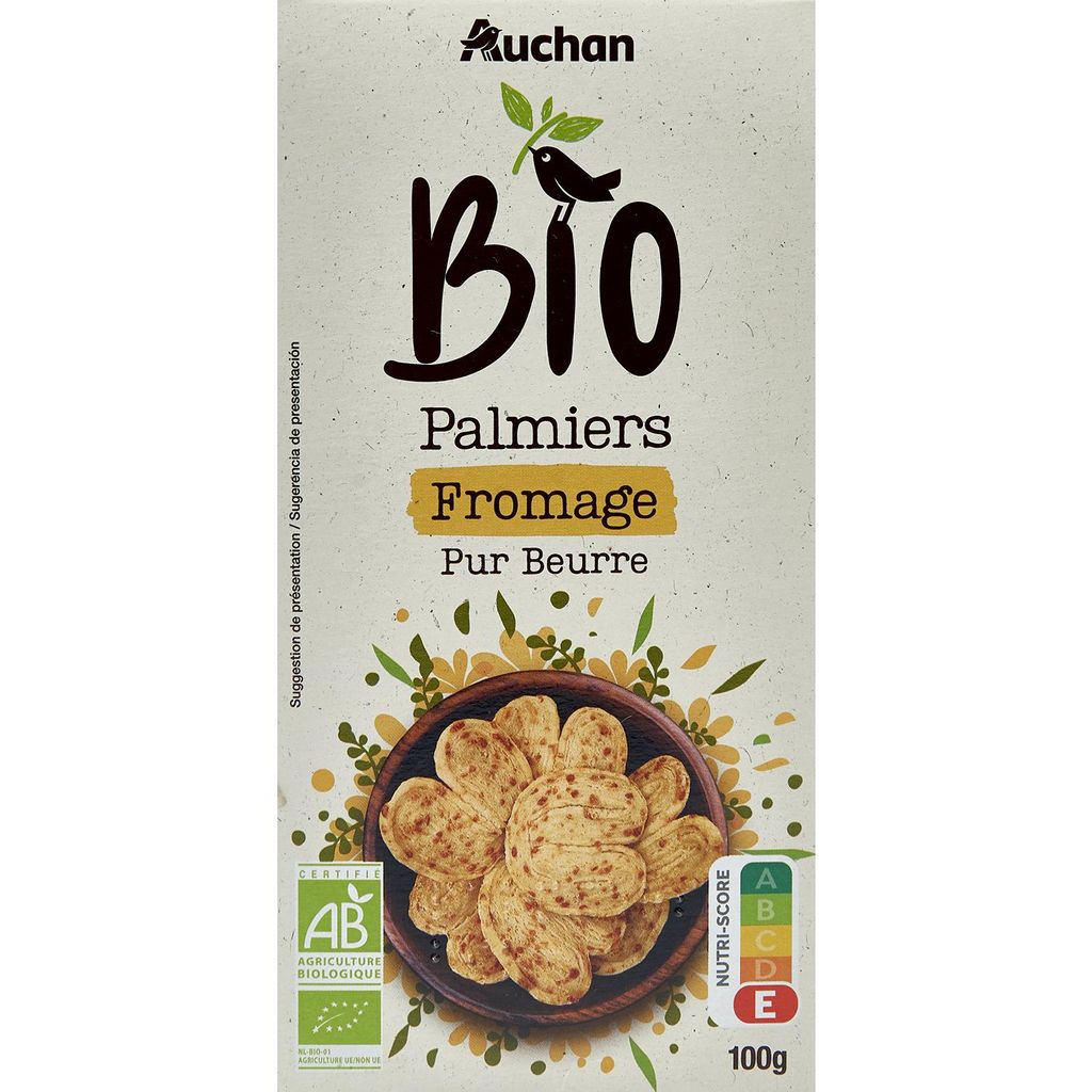 Biscuits feuilletés au beurre et au fromage, issus de l'agriculture biologique. Fabrication certifiée par Skal NL-BIO-01. Distribution certifiée par Ecocert FR-BIO-01