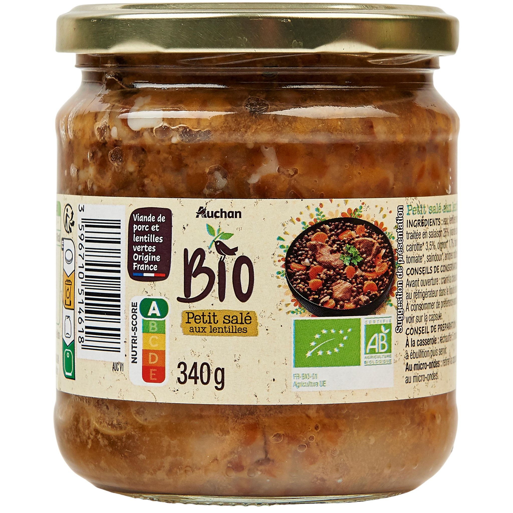 Ingrédients : Eau, lentilles vertes* 29%(origine France), viande de porc traitée en salaison 26%(viande de porc* (origine France), eau, sel de mer), carotte* 3.5%, oignon* 1.7%, farine de BLÉ*, sel de mer, double concentré de tomate*, saindoux*, arômes naturels. *biologiques.