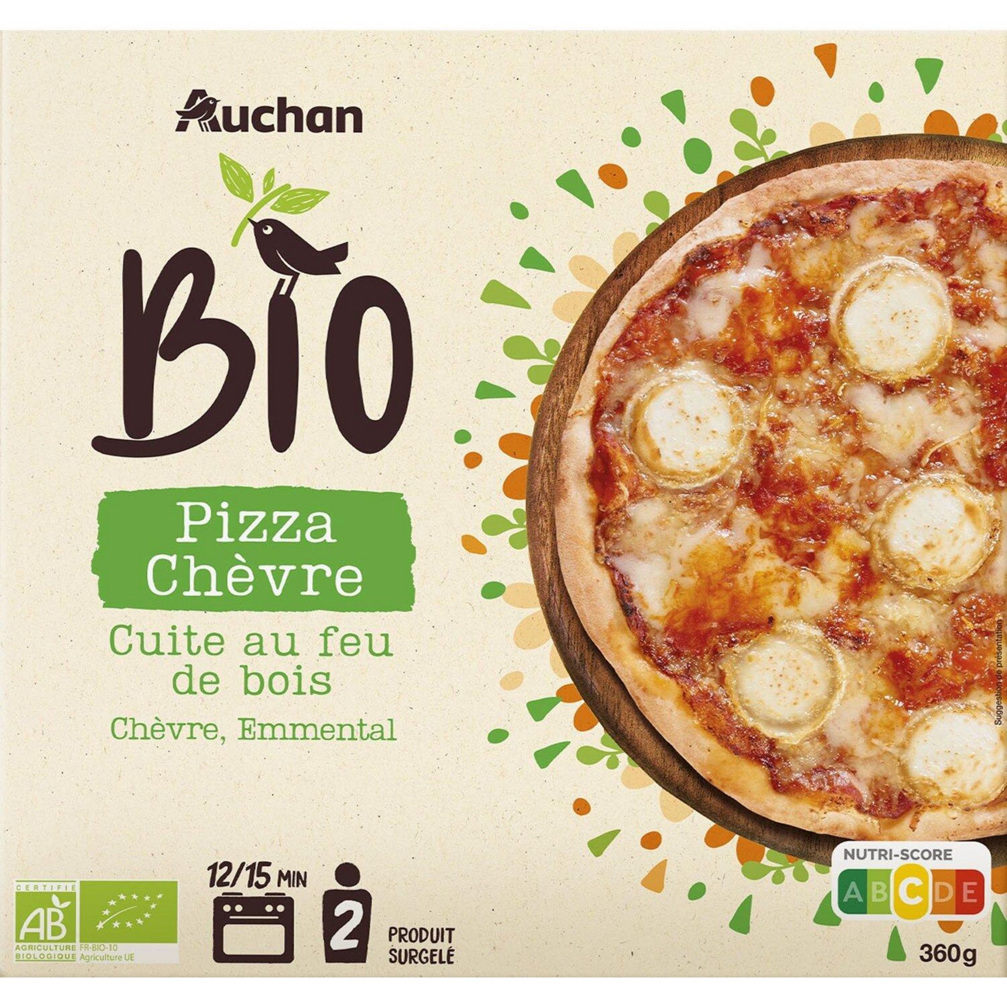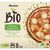 Pizza garnie de fromage de chèvre et d'emmental cuite au feu de bois, issue de l'agriculture biologique, surgelée, Production certifiée par FR-BIO-10 et distribution certifiée par FR-BIO-01