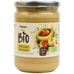 Ingrédients : Purée de pommes** (origine France) 69,6%, purée de bananes** (origine Equateur, Guatemala ou Costa Rica) 30%, antioxydant : acide ascorbique, acidifiant : acide citrique (si les fruits n'en contiennent pas suffisamment). **biologique.