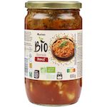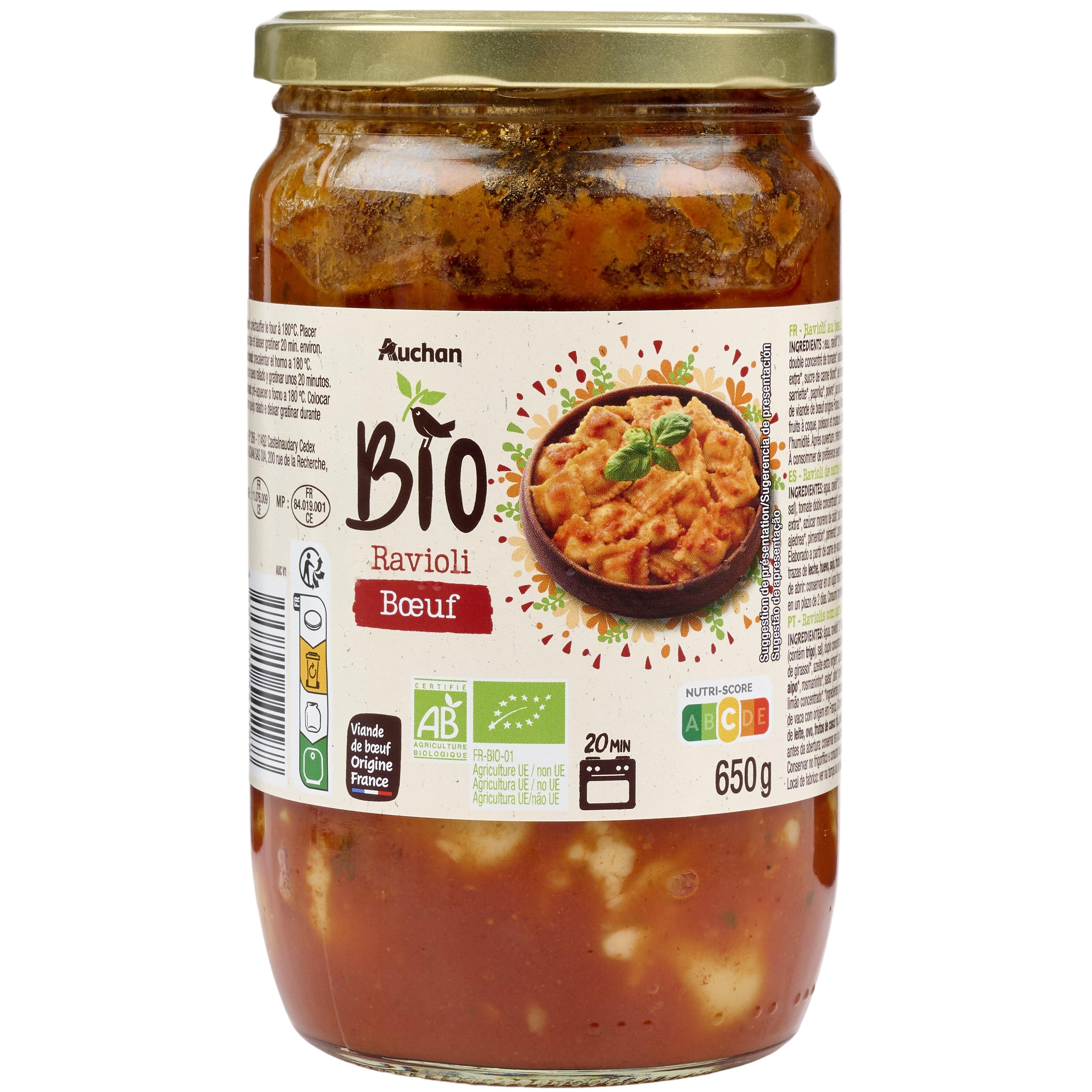 Ingrédients : Eau, ravioli*21% (semoule de blé dur*, eau, viande de bœuf* 19% , chapelure* (contient blé),sel),double concentré de tomates*, viande de bœuf* 3.4%, oignons*,carottes*, huile de tournesol*, huile d'olive vierge extra*, sucre decanne blond*, sel de mer non raffiné, basilic*, céleri*, romarin*, persil*, ail*, thym*, marjolaine*, sarriette*, paprika*, poivre*, jus de citron concentré*.*Ingrédients issus de l'agriculture biologique. Elaboré à partir de viande de bœuf origine France.(Viande de bœuf : 7.5% du poids net total.)Traces éventuelles de lait, œuf, soja, fruits à coque, poisson et crustacés.