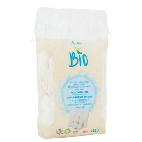 "Les rectangles de coton BIO Auchan sont composés à 100 % de coton biologique. De plus, ils sont ultra-doux, ne peluchent pas et ne se dédoublent pas ! Leur forme rectangulaire facilite leur utilisation grâce à un format adapté à la main. Cela les rend pratiques pour toutes les utilisations : démaquiller, nettoyer, désinfecter ou encore changer bébé. Ils font aussi l'objet d'une certification garantissant une fabrication écologiquement et socialement responsable :• pas d'utilisation de pesticides, d'insecticides ni d'OGM • pas de blanchiment au chlore • conditions de travail saines et rémunération juste des employés • emballage fabriqué à partir de 80 % de plastique recyclé."COSMOS ORGANIC certifié par ECOCERT Greenlife