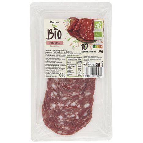Découvrez la rosette bio Auchan, un saucisson fabriqué à partir de porc issu de l'agriculture biologique. Cette rosette coupée en tranches pour plus de commodité est l'accompagnement parfait pour vos apéritifs entre amis ou en famille.