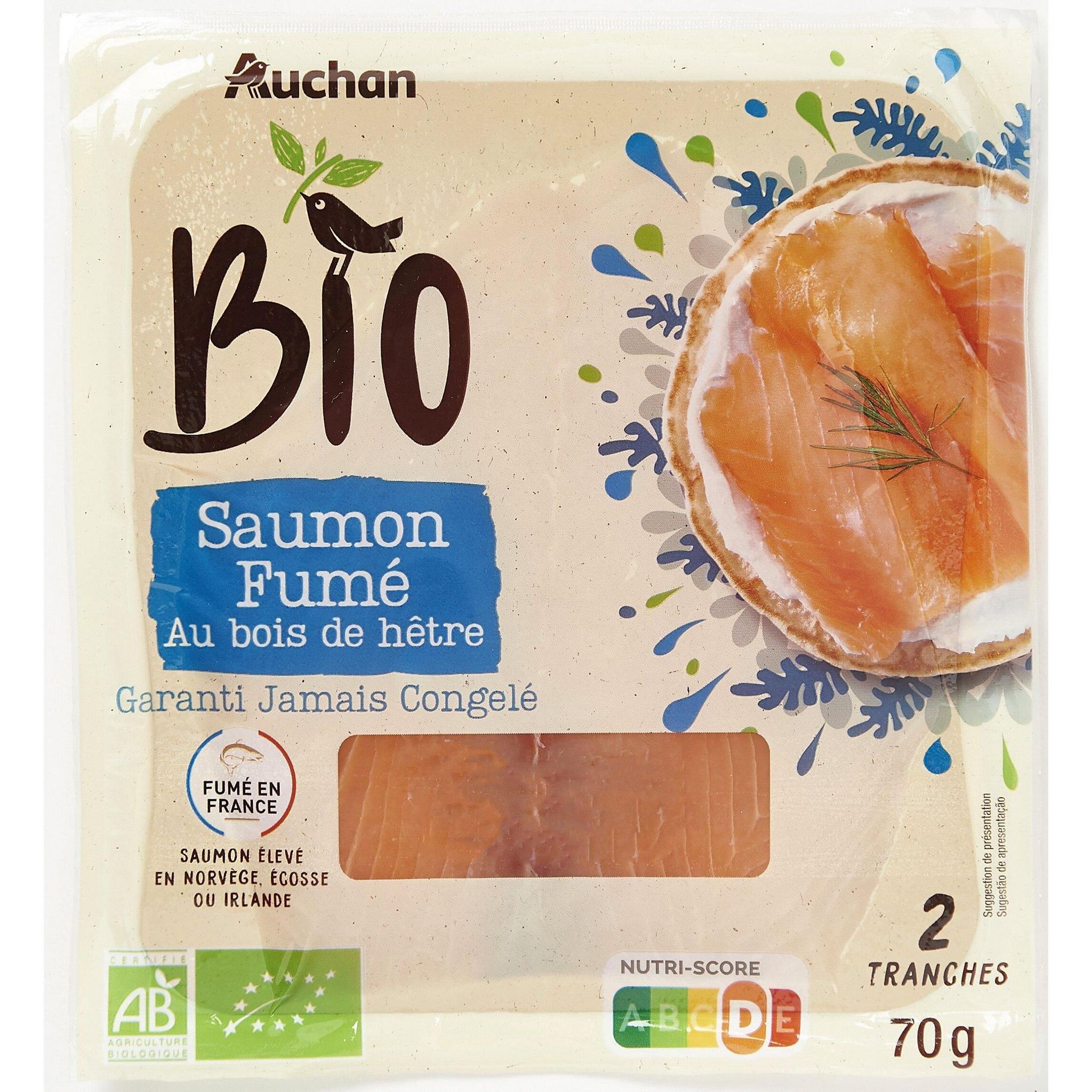 :Afin de faciliter la séparation de vos tranches de saumon fumé, nous vous conseillons d'ouvrir l'emballage 15 minutes avant présentation.Le saumon fumé Auchan Bio se déguste au naturel ou avec une pointe de crème fraîche et un filet de jus de citron.