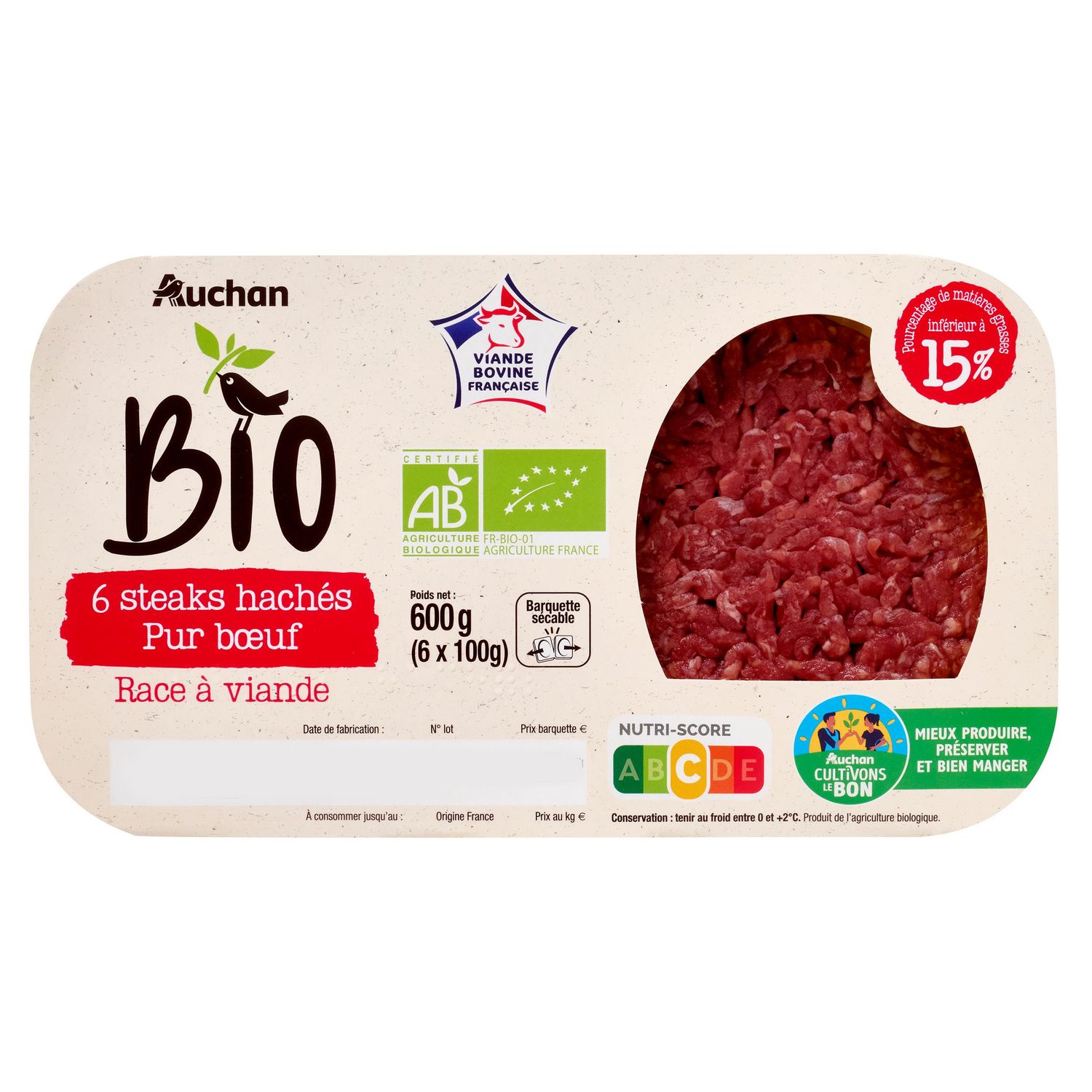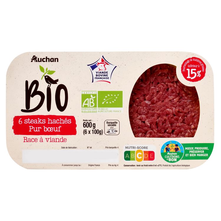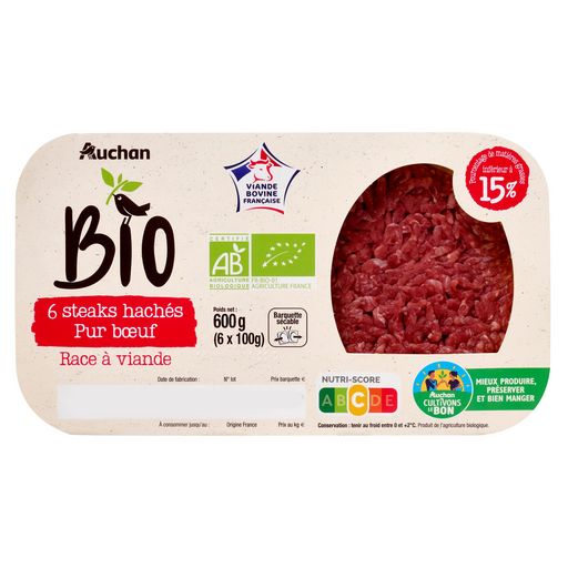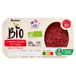 6 steaks hachés pur bœuf issus de l'agriculture biologique.