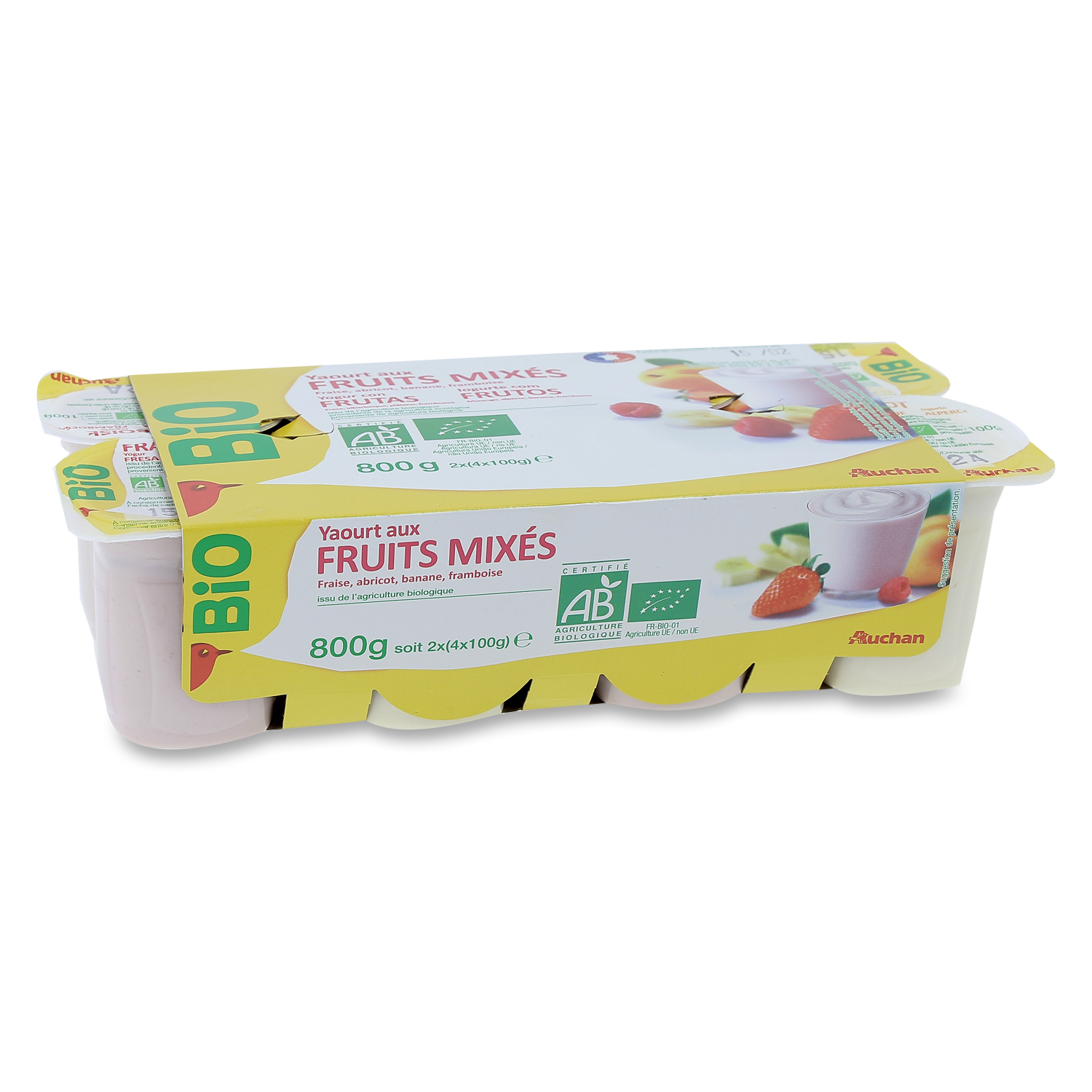 Lait entier*, sucre de canne* 7,8%, fruits 5% (abricot*, banane*, framboise*, fraise*), poudre de lait écrémé*, amidon natif de maïs, arômes naturels, jus de sureau*, jus de carotte*, jus de citron*, ferments lactiques . * biologiqueElaboré à partir de lait origine France