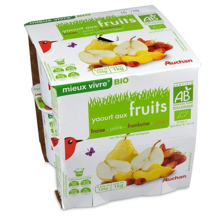 Lait entier*, fruits 10% (fraise*, abricot*, framboise*, poire*), sucre de canne* 8,6%, poudre de lait écrémé*, amidon natif de maïs ; épaississant : pectines ; jus concentré de sureau*, jus concentré de citron*,jus concentré de carotte*, arômes naturels, ferments lactiques. * biologiqueElaboré à partir de lait origine France.