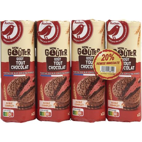 Ingrédients : Farine de BLÉ 29.5 % (origine France), sucre, farine complète de BLÉ 16% (origine France), graisse de palme, cacao maigre en poudre 8,7%, sirop de glucose, amidon de BLÉ poudres à lever : carbonates d'ammonium, carbonates de sodium, diphosphates huile de colza, LAIT écrémé en poudre, émulsifiant : lécithines (tournesol), amidon de riz, sel, extrait de malt d'ORGE, arôme naturel agent de traitement de la farine : DISULFITES de sodium. Traces éventuelles d'œufs.