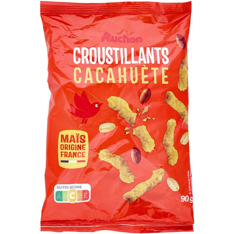 Ingrédients : Semoule de maïs 66%, cacahuètes (ARACHIDES) grillées moulues 34%, huile de colza, sel, arômes naturels, farine de riz, fibre de pomme de terre.Traces éventuelles de céréales contenant du gluten, crustacés et lait. Elaboré à partir de maïs origine France.