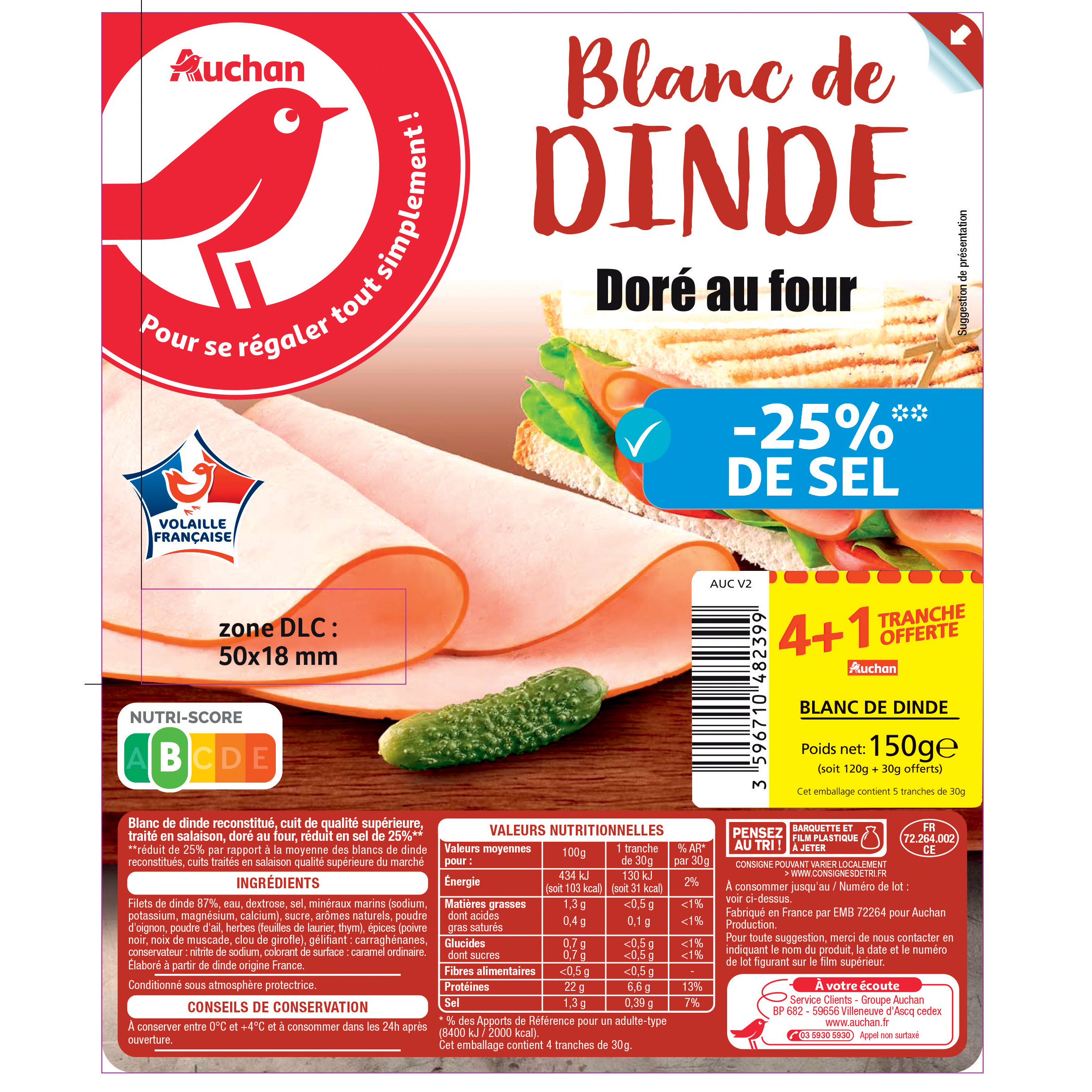 Ingrédients : Filets de dinde 87 %, eau, dextrose, sel, minéraux marins (potassium, magnésium, calcium), sucre, arômes naturels, poudre d’oignon, herbes (feuilles de laurier, thym), épices (poivre noir, noix de muscade, clou de girofle), conservateur : nitrite de sodium. Elaboré à partir de dinde origine France.