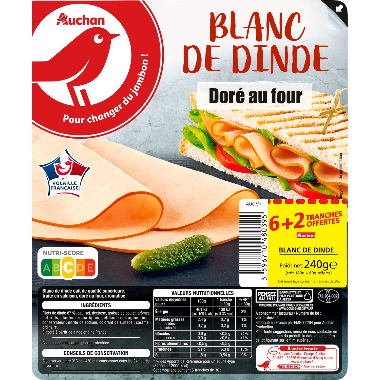 Le produit est correct. Mais c'est aléatoire. J'ai pris ce produit à plusieurs reprises. Et certaine fois, il y avait un effet "plastique" pas dans le gout, mais dans la texture. Et le prix au kg n'est pa cohérent avec la quantité. Bien souvent le 6 tranche est moins cher au kg que le huit tranches. Obligé de surveiller à chaque fois.