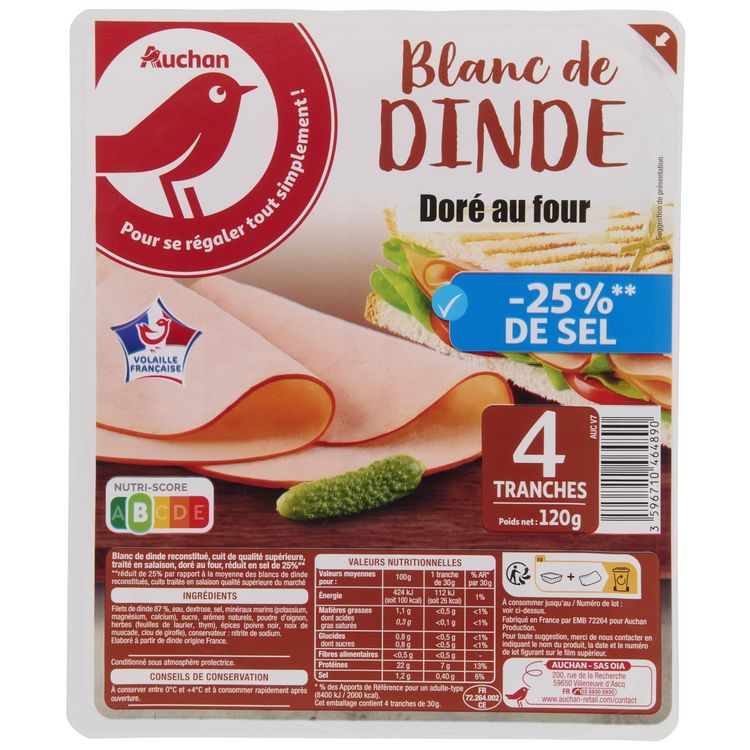 Ingrédients : Filets de dinde 87 %, eau, dextrose, sel, minéraux marins (potassium, magnésium, calcium), sucre, arômes naturels, poudre d’oignon, herbes (feuilles de laurier, thym), épices (poivre noir, noix de muscade, clou de girofle), conservateur : nitrite de sodium. Elaboré à partir de dinde origine France.