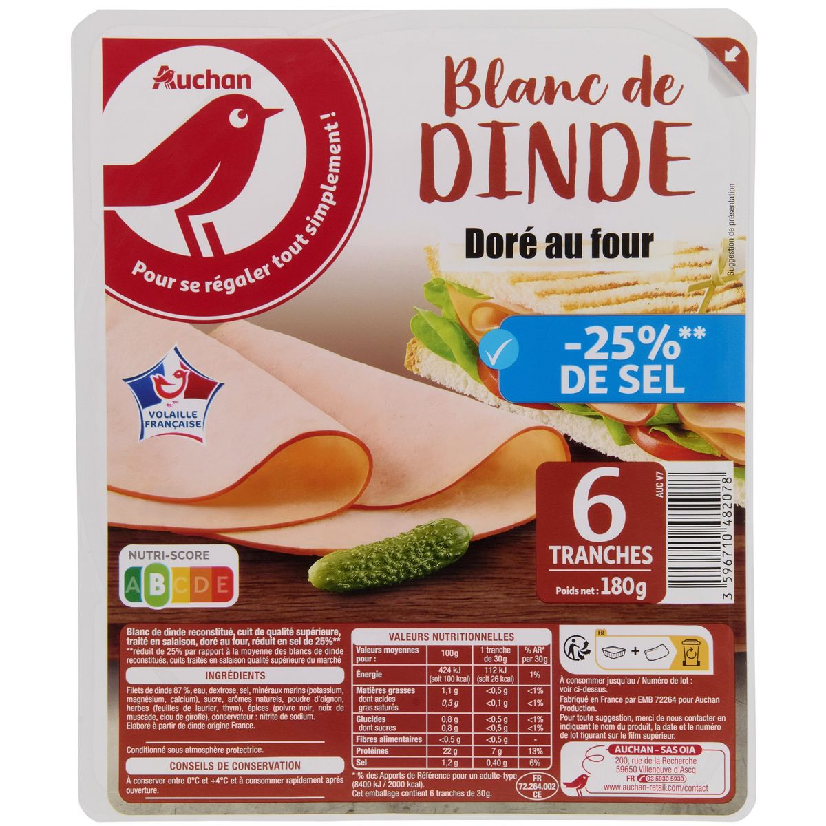 Ingrédients : Filets de dinde 87 %, eau, dextrose, sel, minéraux marins (potassium, magnésium, calcium), sucre, arômes naturels, poudre d’oignon, herbes (feuilles de laurier, thym), épices (poivre noir, noix de muscade, clou de girofle), conservateur : nitrite de sodium.Elaboré à partir de dinde origine France.