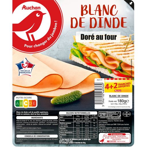 Ingrédients : Filet de dinde 86%, eau, sel, dextrose, graisse de poulet, arômes naturels, plantes aromatiques, sucre, oignon en poudre, ail en poudre, herbes (laurier, thym), épices (poivre noir, noix de muscade, girofle), conservateur : nitrite de sodium, gélifiant : carraghénanes. Elaboré à partir de dinde origine France.