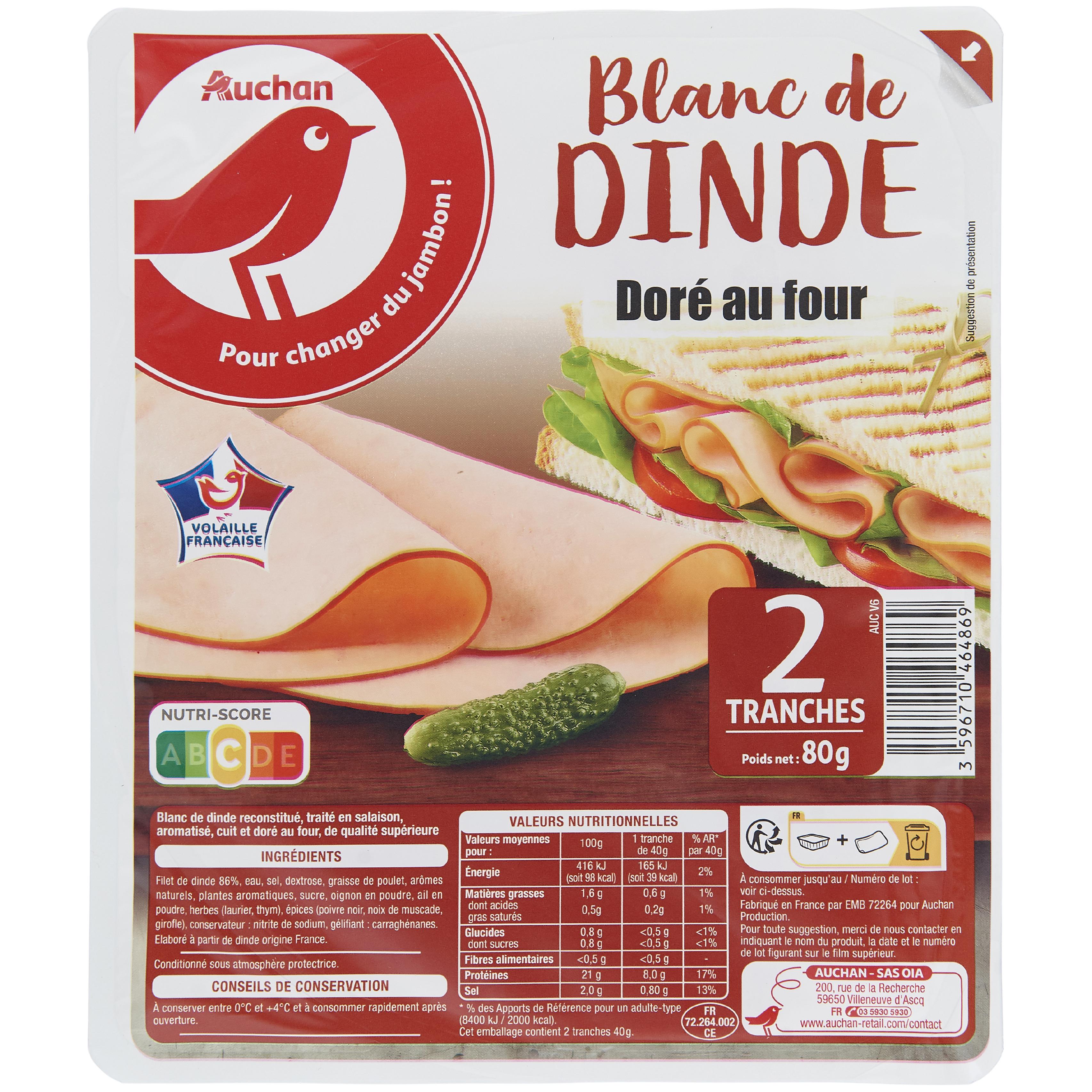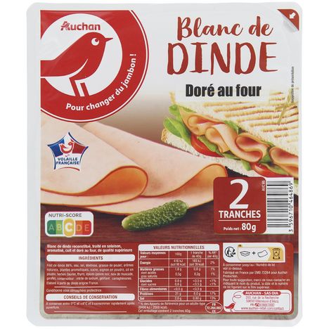 Ingrédients : Filet de dinde 86%, eau, sel, dextrose, graisse de poulet, arômes naturels, plantes aromatiques, sucre, oignon en poudre, ail en poudre, herbes (laurier, thym), épices (poivre noir, noix de muscade, girofle), conservateur : nitrite de sodium, gélifiant : carraghénanes. Elaboré à partir de dinde origine France.