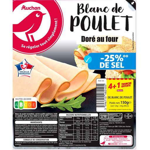 AUCHAN BLANC POULET TAUX DE SEL REDUIT 4 TRANCHES + 1 OFFERTES