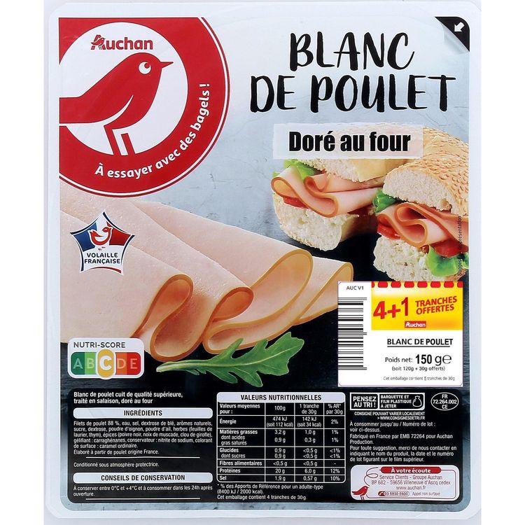 AUCHAN BLANC POULET 4 TRANCHES + 1 OFFERTE