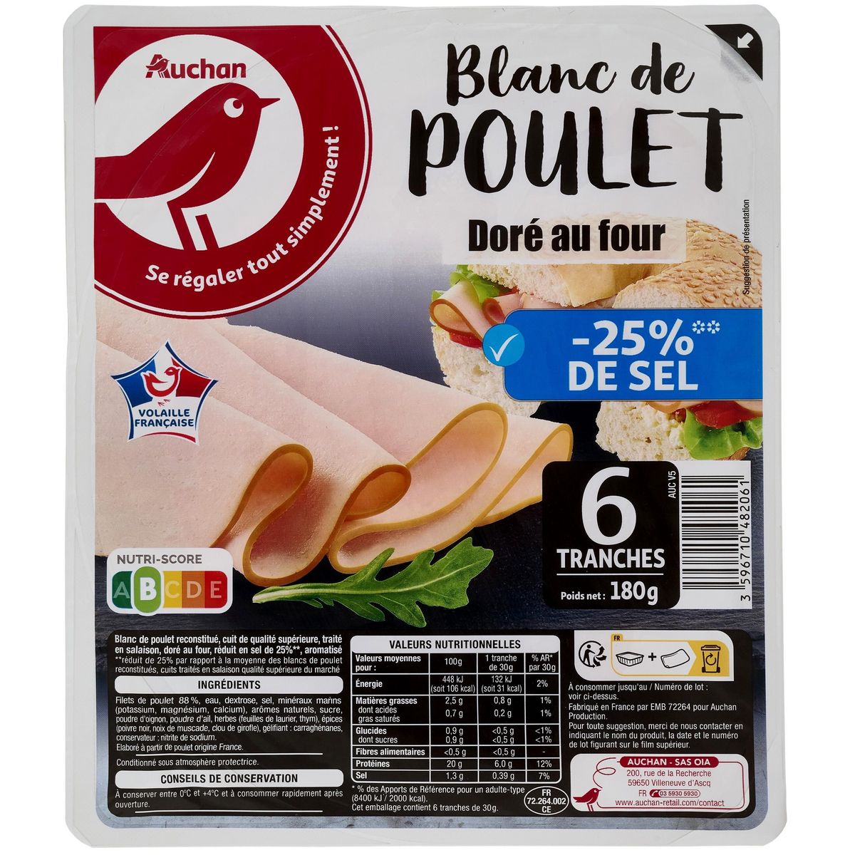 Ingrédients : Filets de poulet 88 %, eau, dextrose, sel, minéraux marins (potassium, magnésium, calcium), arômes naturels, sucre, poudre d'oignon, poudre d'ail, herbes (feuilles de laurier, thym), épices (poivre noir, noix de muscade, clou de girofle), gélifiant : carraghénanes, conservateur : nitrite de sodium. Elaboré à partir de poulet origine France. ** Réduit de 25% par rapport à la moyenne des blancs de poulet reconstitué, cuits traités en salaison qualité supérieure du marché