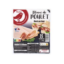 Ingrédients : Filets de poulet 88 %, eau, sel, dextrose, arômes naturels, sucre, poudre d'oignon, poudre d'ail, herbes (feuilles de laurier, thym), épices (poivre noir, noix de muscade, clou de girofle), gélifiant : carraghénanes, conservateur : nitrite de sodium.Elaboré à partir de poulet origine France.