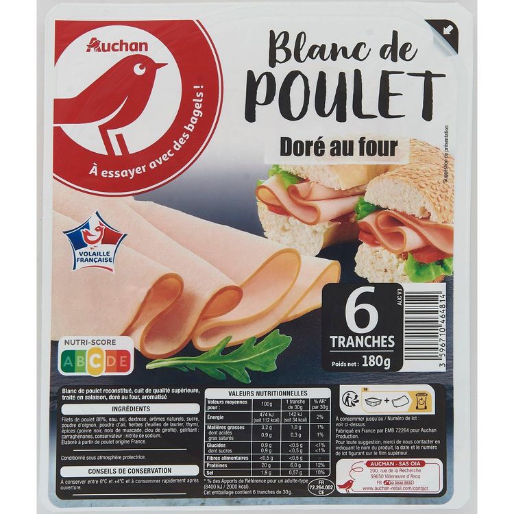 Ingrédients : Filets de poulet 88 %, eau, sel, dextrose, arômes naturels, sucre, poudre d'oignon, poudre d'ail, herbes (feuilles de laurier, thym), épices (poivre noir, noix de muscade, clou de girofle), gélifiant : carraghénanes, conservateur : nitrite de sodium.Elaboré à partir de poulet origine France.