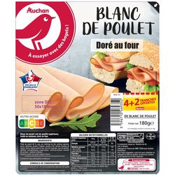 Blanc de poulet reconstitué, cuit de qualité supérieure, traité en salaison, doré au four, aromatisé