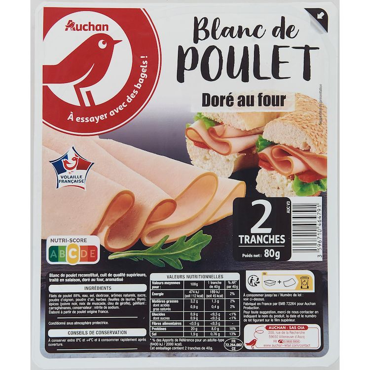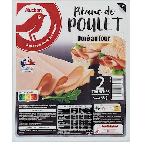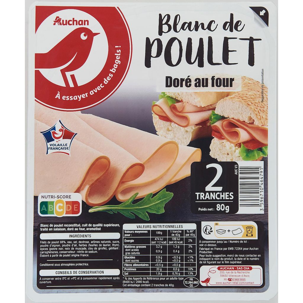Ingrédients : Filets de poulet 88 %, eau, sel, dextrose, arômes naturels, sucre, poudre d'oignon, poudre d'ail, herbes (feuilles de laurier, thym), épices (poivre noir, noix de muscade, clou de girofle), gélifiant : carraghénanes, conservateur : nitrite de sodium.Elaboré à partir de poulet origine France.