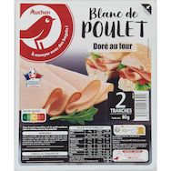 Blanc de poulet reconstitué, cuit de qualité supérieure, traité en salaison doré, au four, aromatisé