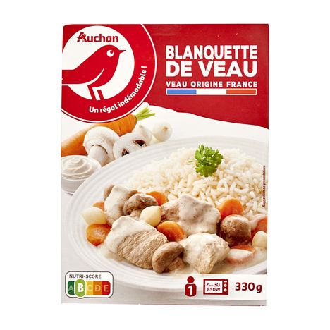 Riz cuit 40% (eau, riz), viande de veau traitée en salaison 24% (viande de veau 20%, eau, fécule de manioc, sel), crème fraîche (contient lait) 6%, lait demi-écrémé (contient lait), eau, champignon de Paris 4% (champignon de Paris, eau, sel, acidifiant : acide citrique, antioxydant : acide ascorbique), carotte 4%, oignon grelot 3%, huile de tournesol, sel, farine de blé (contient gluten), oignon en poudre, vin blanc, jus de citron, pulpe d'ail, épaississant : gomme xanthane, laurier, thym, muscade, poivre, girofle.Pourcentages exprimés sur le total de la recette. Elaboré à partir de veau origine France et de lait origine UE et Suisse.