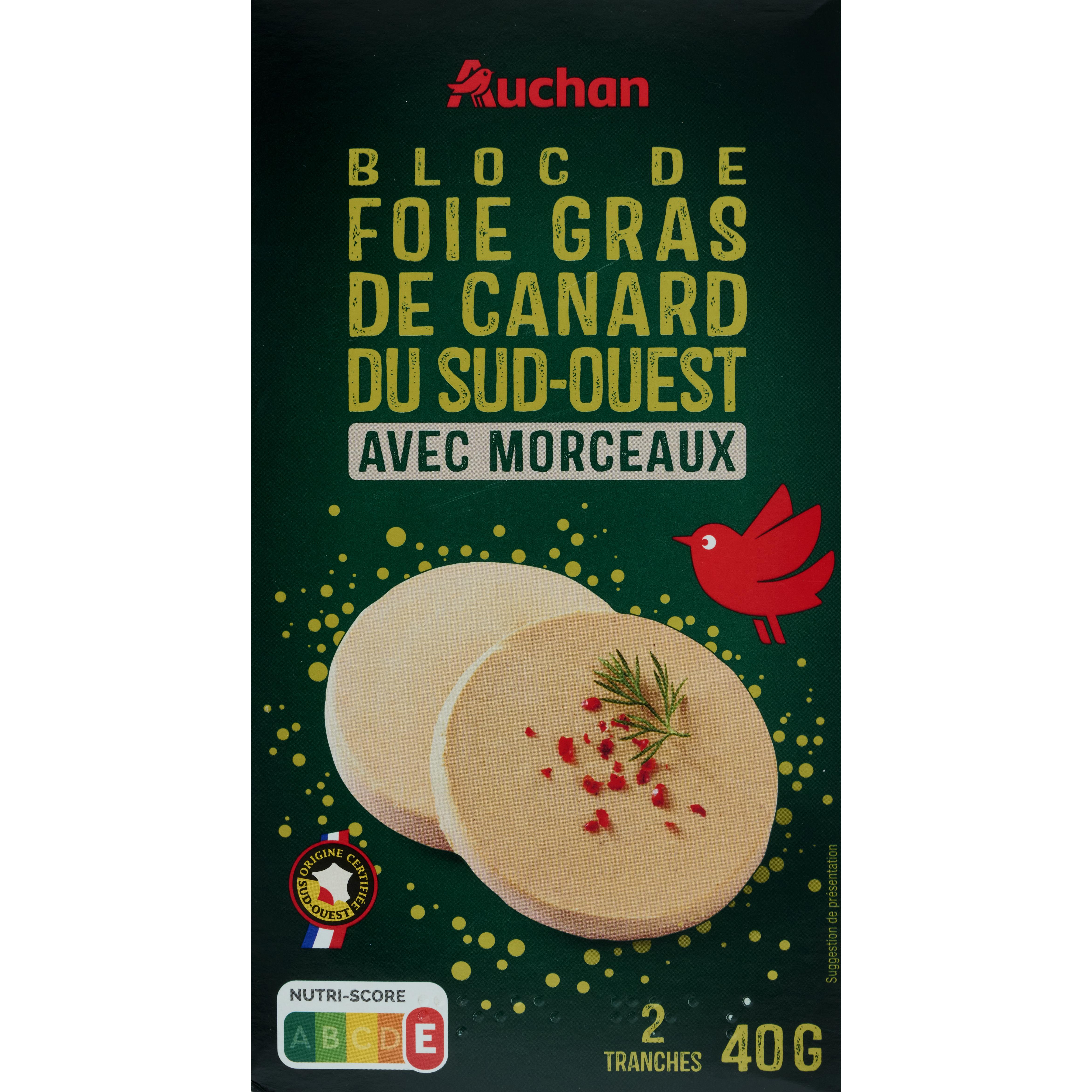 Un bloc de foie gras de canard avec 30% de morceaux issues de canards nés et élevés en France. Ideal pour une entrée a deux!