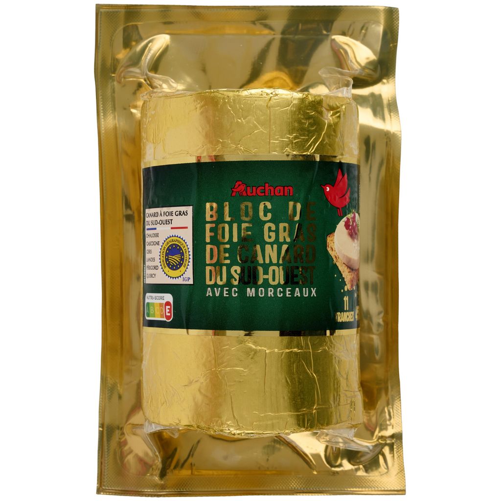 Découvrez le bloc de foie gras de canard avec 30% de morceaux, une délicieuse spécialité Auchan fabriquée à partir de canards originaires du Sud Ouest qui ravira vos papilles