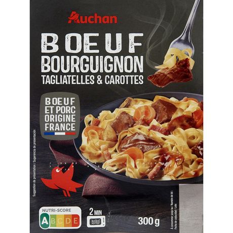 Ingrédients : Eau, jarret de bœuf (origine France) 15%, pâtes aux OEUFS frais (semoule de BLÉ dur, OEUF frais) 14%, carottes 6,4%, vin rouge 5,9%, oignons 5,1%,champignons de Paris 2,1%, lardons cuits fumés 1,9% [poitrine de porc (origineFrance), sel, dextrose, antioxydant : érythorbate de sodium, conservateur :nitrite de sodium], fond de veau (viande et jus de cuisson de veau, sel),tomate en poudre, huile de colza, bouillon de légumes [légumes et jus decuisson de légumes (carotte, poireau, oignon, ail), extrait de vin blanc, sel,huile de tournesol, extraits d'épices], amidon de maïs, huile d'olive, fécule de pomme de terre, sel, ail, beurre (LAIT origine UE), protéines de LAIT (LAIT origine UE), arômes naturels, extrait de MALT, préparation bouquet garni(maltodextrine, plantes aromatiques, sel, extrait d'épice et de plantesaromatiques), poivre blanc, maltodextrine et antioxydant : ascorbate de sodium.Pourcentages exprimés sur le total de la recette.Traces éventuelles de soja, céleri, poisson,crustacés, mollusques, moutarde, graines de sésame, fruits à coque etarachides.