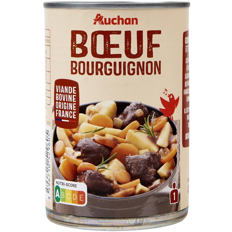Ingrédients : Pommes de terre 22% (dont conservateur, disulfite de sodium) , viande bovine traitée en salaison etprécuite 20% (viande bovine 15,3%, eau, sel, stabilisant : triphosphates,gélifiant : carraghénanes), eau, carottes 18%, vin rouge 8%(contient sulfites),oignons 7%, huile de colza, amidon modifié de maïs, double concentré detomates, colorant : caramel ordinaire, sel, cacao maigre en poudre, gélifiants: gomme guar et gomme xanthane, sucre, arôme naturel d'oignon, arôme naturel dethym, poivre, arôme naturel d'ail, arôme naturel de laurier.Élaboré à partir de viande bovine origine France.