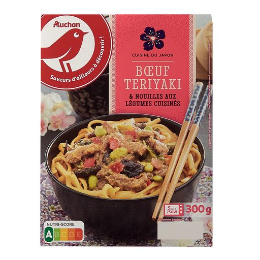 Ingrédients : Pâtes alimentaires type linguine cuites 36% (eau, semoule de BLÉ dur), viande de bœuf (origine France) 14%, assaisonnement mirin 13% [sirop de glucose, eau, extrait de riz fermenté (eau, riz, alcool, sel), sucre, vinaigre d'alcool, mélasse de canne à sucre], poivrons rouges 4,2%, ciboule 4,1%, fèves de SOJA 4,1%, chou choy sum 4,1%, champignons oreilles de Judas 4,1%, sauce SOJA 2,9% (eau, graines de SOJA, BLÉ, sel), huiles végétales (colza, SÉSAME, SOJA, tournesol), eau, gingembre, ail, ŒUFS, sucre, amidon de pomme de terre, sirop de glucose, pâte de piments rouges écrasés (piments rouges, sel), jus de citron vert à base de concentré, jaune d’ŒUFS, blanc d'ŒUFS, protéines de LAIT, caramel (sirop de glucose, eau, sucre), fibres végétales, sel stabilisants : carraghénanes, gomme guar, gomme xanthane dextrose, gélatine bovine, émulsifiant : lécithines (contient SOJA), acidifiant : lactate de potassium, poivre blanc. Traces éventuelles de moutarde, mollusques, crustacés, poissons, céleri, arachides et fruits à coque. Pourcentages exprimés sur le total de la recette.