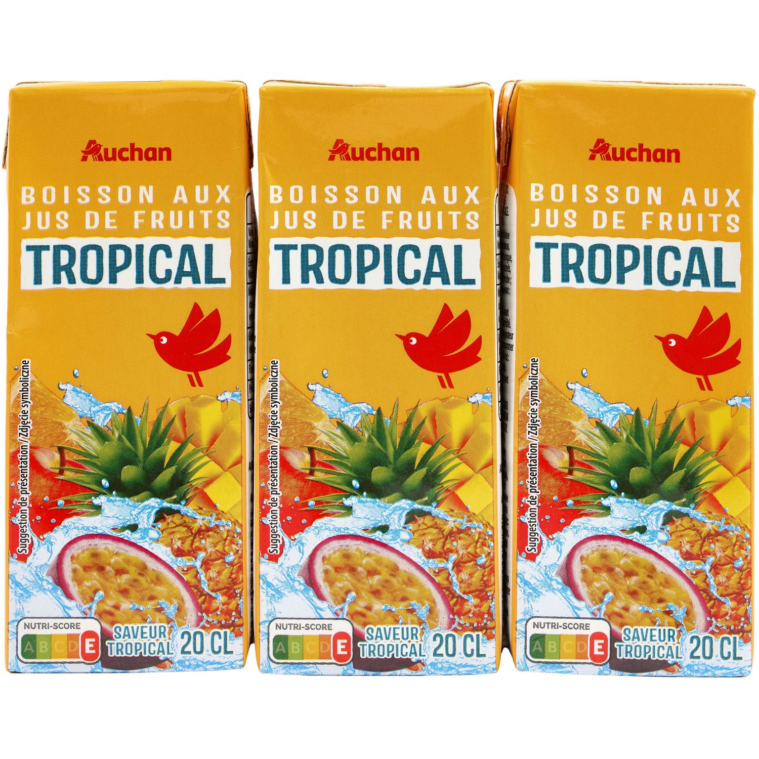 Boisson aux jus de fruits partiellement à base de concentrés, saveur tropicale.Teneur en fruits : 12%.