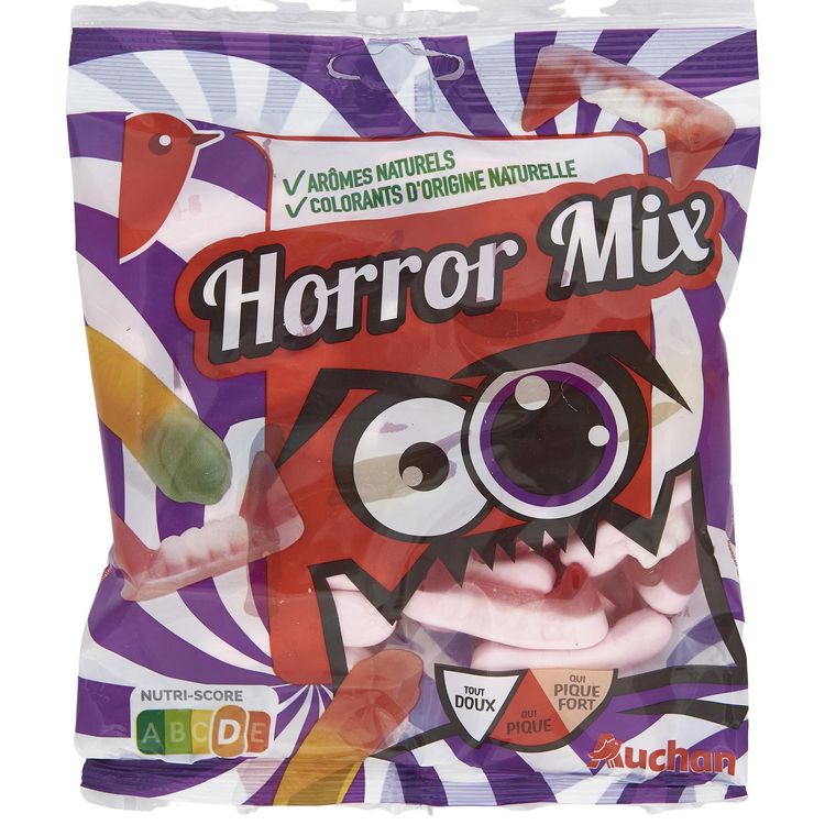 Ingrédients : Sirop de glucose, sucre, gélatine de porc, acidifiant : acide citrique, arômes naturels, agent d'enrobage : cire de carnauba, huile de tournesol, colorants : anthocyanes, extrait de paprika, curcumine, denrée alimentaire colorante : concentré de spiruline et de pomme, arôme naturel d'orange, arôme naturel de citron avec autres arômes naturels. Amidon de BLÉ
