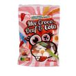 Ingrédients : Sirop de glucose, sucre, gélatine, acidifiant : acide citrique, amidon modifié, arômes naturels, agent d'enrobage : cire de carnauba, huile de tournesol, colorants : caramel ordinaire, extrait de paprika, curcumine, anthocyanes, arôme naturel de citron avec autres arômes naturels, denrées alimentaires colorantes : concentres de spiruline, pomme et carthame, arôme naturel d'orange. Amidon de BLÉ