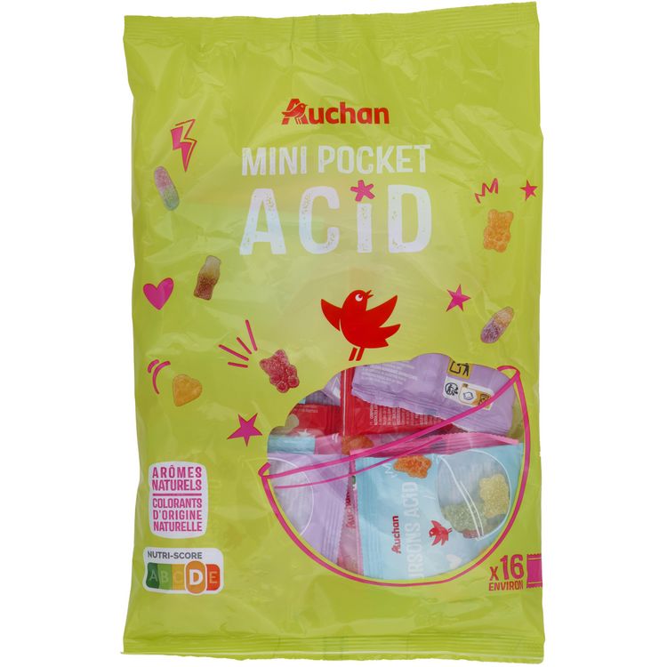 AUCHAN MULTIPACK ACIDE 400G : 16 sachets de pure explosion acide ! Le plein de sensations fortes pour les amateurs de bonbons qui piquent !