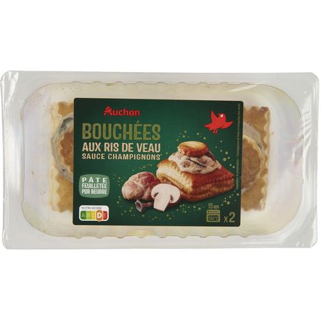 Ingrédients : Pâte feuilletée 42,3% [farine de BLÉ, beurre 10,7% (LAIT origine UE ou Royaume-Uni), eau, sel, gluten de BLÉ], ris de veau 15,8% (Origine : UE), eau, champignons de Paris 6,8%, crème fraîche (LAIT origine France), farine de BLÉ, beurre (LAIT origine UE ou Royaume-Uni), échalotes, trompettes des morts 1,2%, vin blanc, Vermouth, fond de poulet [os de poulet, viande de poulet (Origine : France), graisse de poulet, eau], Porto rouge, maltodextrine, sel, jaunes d'ŒUFS en poudre, gelée [gélatine alimentaire (porc origine UE), sel, dextrose, acidifiants : acide citrique acétates de sodium, arômes], arômes naturels, jaunes d'ŒUFS, poivre. Traces éventuelles de poissons, mollusques, crustacés, céleri, moutarde, soja et fruits à coque.