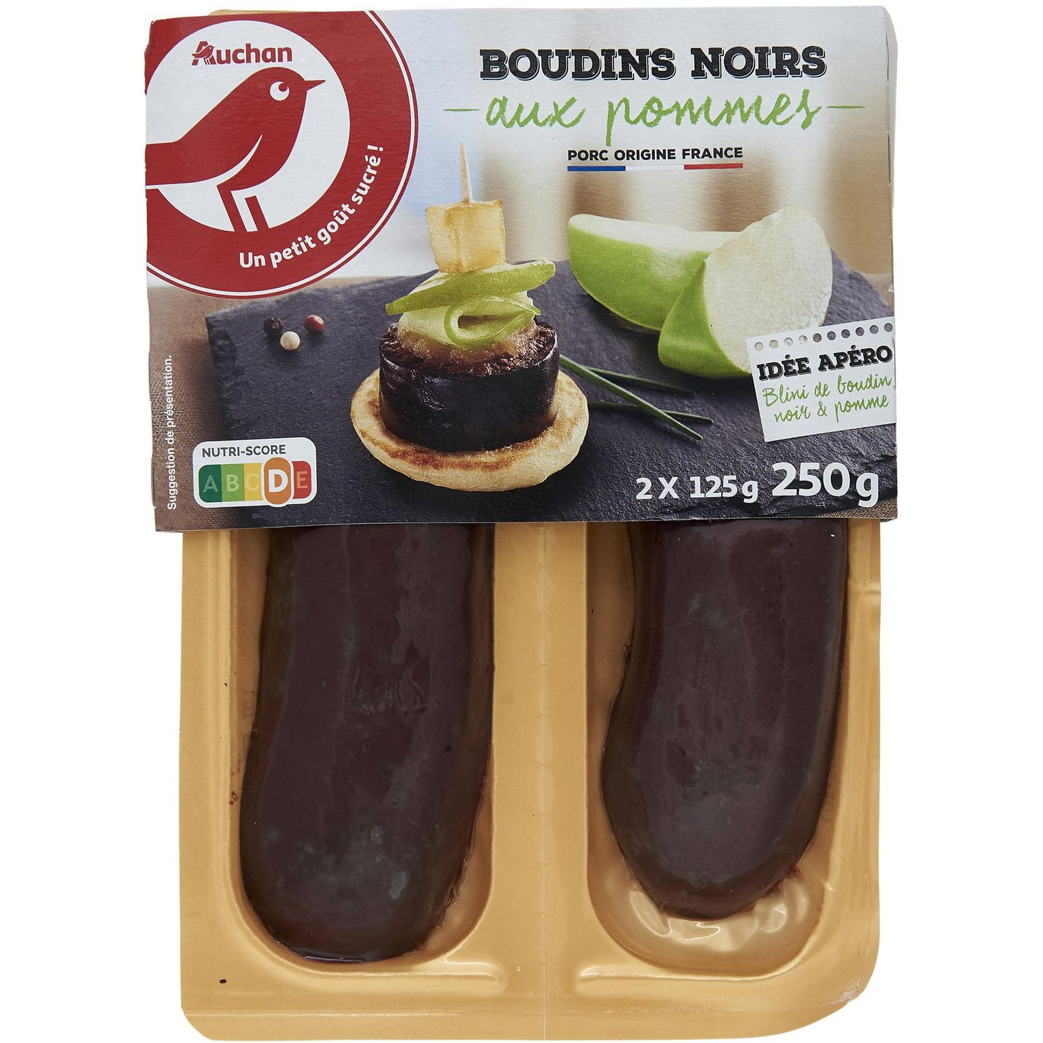 Ingrédients : Sang de porc, gras de porc, oignons, pommes 5%, eau, caramel (sucre, eau), couenne de porc, sucre liquide, sel, alcoolat de pomme, sucre, jus concentré de pomme, épices, plantes aromatiques, boyau naturel de porc. Traces éventuelle de gluten, lait, œufs, moutarde, fruits à coque, mollusques. Elaboré à partir de porc origine France et de pommes ne provenant pas de France.