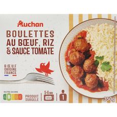 sauce à la tomate et aux légumes (50%), riz cuit et boulettes au bœuf pré-frites, surgelés.