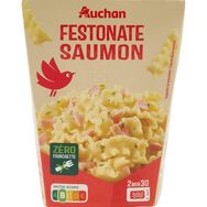 Ingrédients : Pâtes aux ŒUFS cuites 50% (eau, semoule de BLÉ dur, ŒUFS 5%), eau, crème fraîche (LAIT origine France), saumon Atlantique ( Salmo Salar ) (POISSON) 7%, saumon Atlantique fumé 4% [ saumon Atlantique ( Salmo Salar ) (POISSON) 3% ,sel], LACTOSE et protéines de LAIT , vin blanc, farine de BLÉ , huile de tournesol, jus de citron 0,5%, purée d'ail, sel, basilic, zeste de citron 0,1%, épaississant : gomme xanthane, poivre. Traces éventuelles de céleri, moutarde, sulfites, crustacés, soja, mollusque, fruits à coques, sésame. Pourcentages exprimés sur le total de la recette.