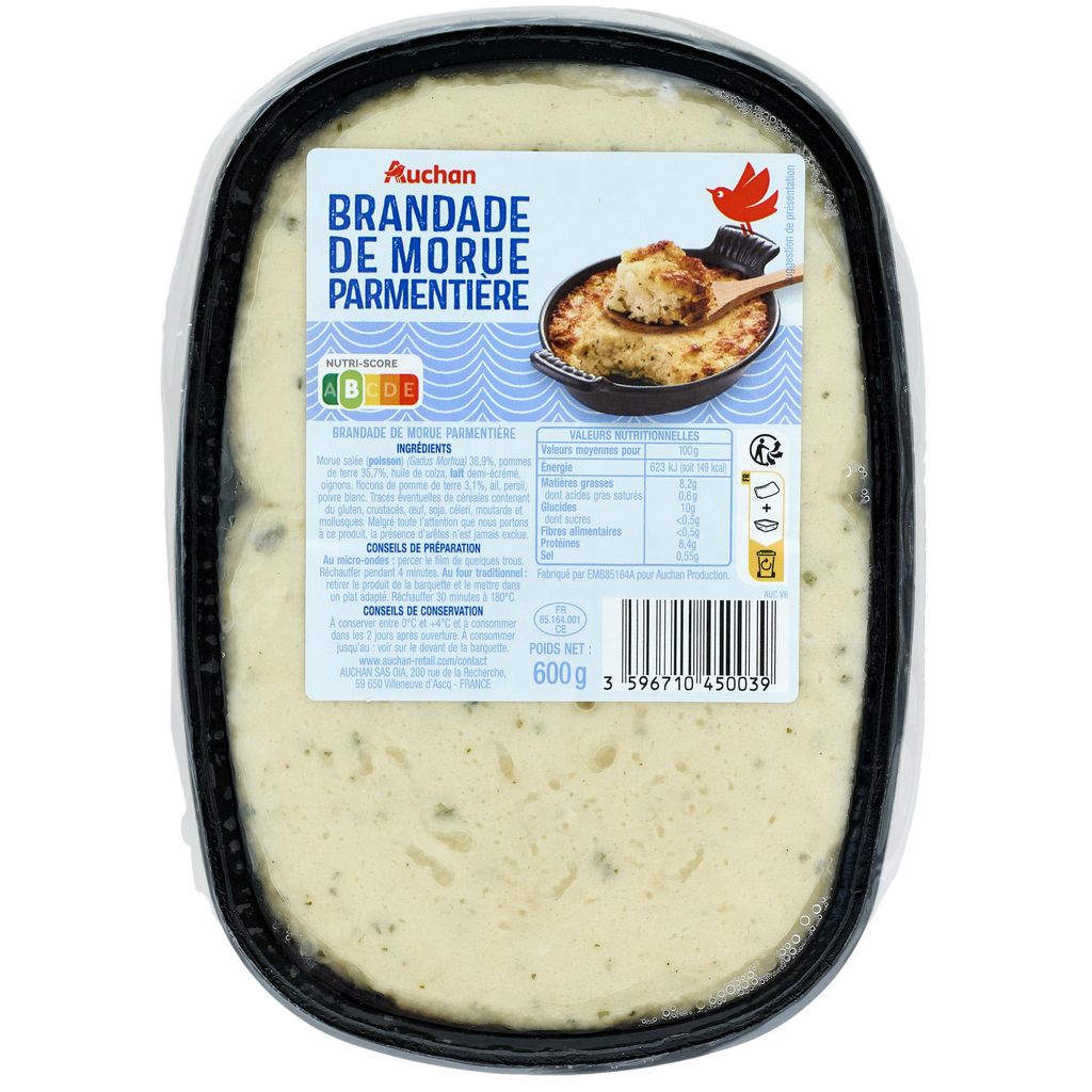 Ingrédients : Morue salée (POISSON) (Gadus Morhua) 38,9%, pommes de terre 35,7%, huile de colza, LAIT demi-écrémé, oignons, flocons de pomme de terre 3,1%, ail, persil, poivre blanc. Traces éventuelles de céréales contenant du gluten, crustacés, oeuf, soja, céleri, moutarde et mollusques.