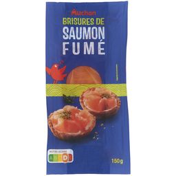 Brisures de saumon Atlantique fumé (Salmo Salar) élevé en Norvège, Ecosse (Royaume-Uni), Irlande, Islande, Danemark( iles Féroé) ou France, décongelé. Ne pas recongeler.