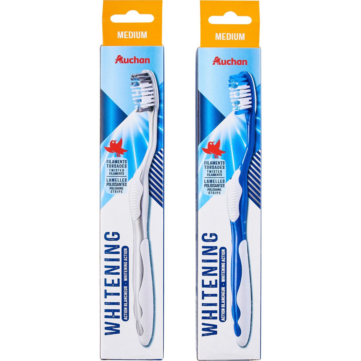 Retrouvez un sourire éclatant avec la brosse à dents Blancheur médium AUCHAN. Elle vous offre un soin blancheur grâce à ses filaments torsadés et ses lamelles polissantes qui aident à enlever les tâches superficielles des dents. Le gratte-langue au dos de la tête permet une hygiène complète de la bouche par son action sur la langue et l'intérieur des joues. Le protège-tête permet de la transporter facilement.