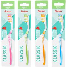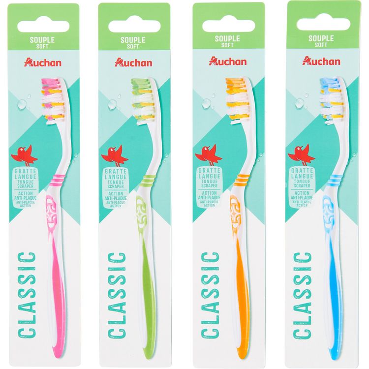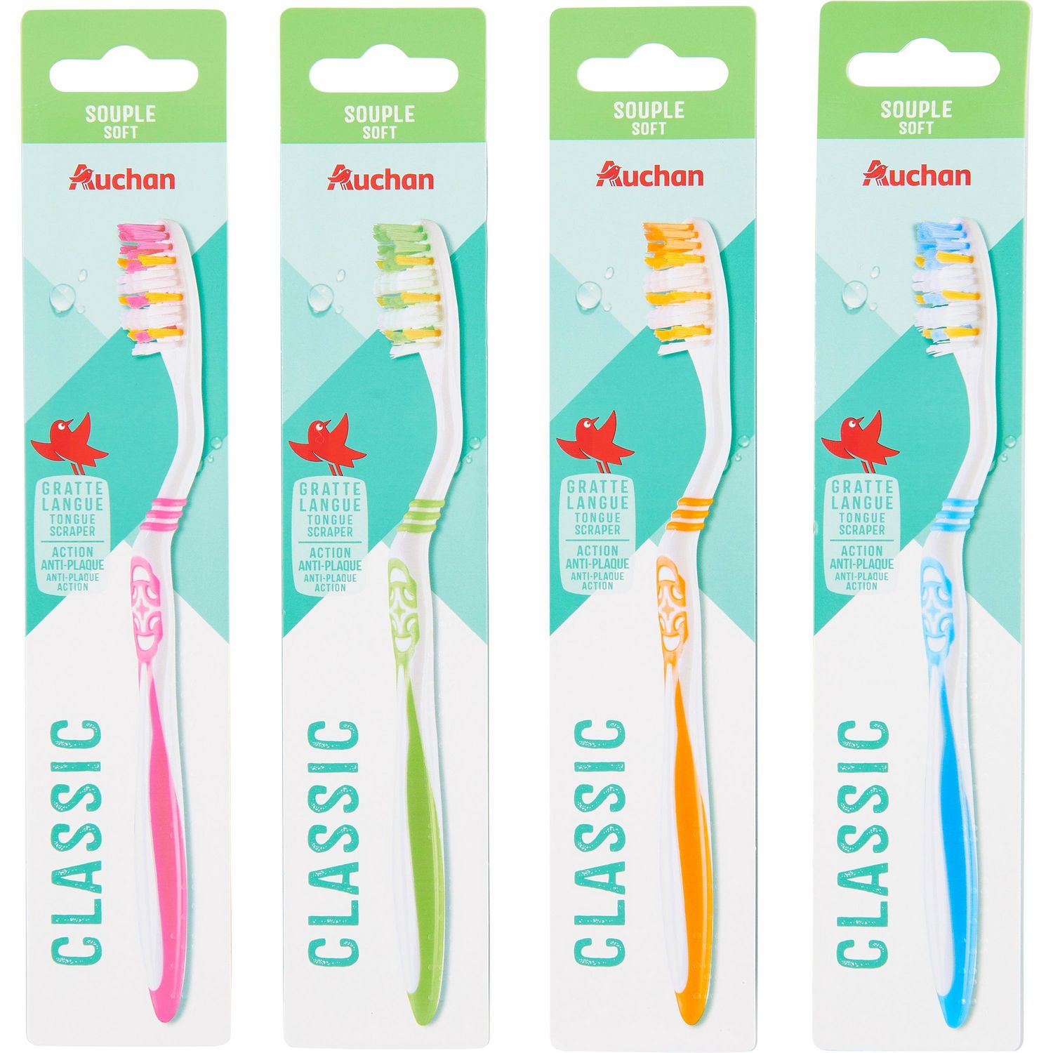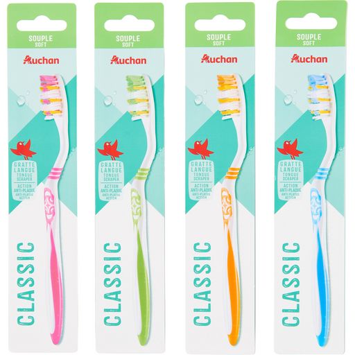 Retrouvez le sourire avec la brosse à dents souple AUCHAN. Le manche ergonomique permet une meilleure prise en main pour une plus grande précision de brossage. Elle aide à combattre la plaque dentaire. Le gratte-langue au dos de la tête permet une hygiène complète de la bouche par son action sur la langue et l'intérieur des joues.