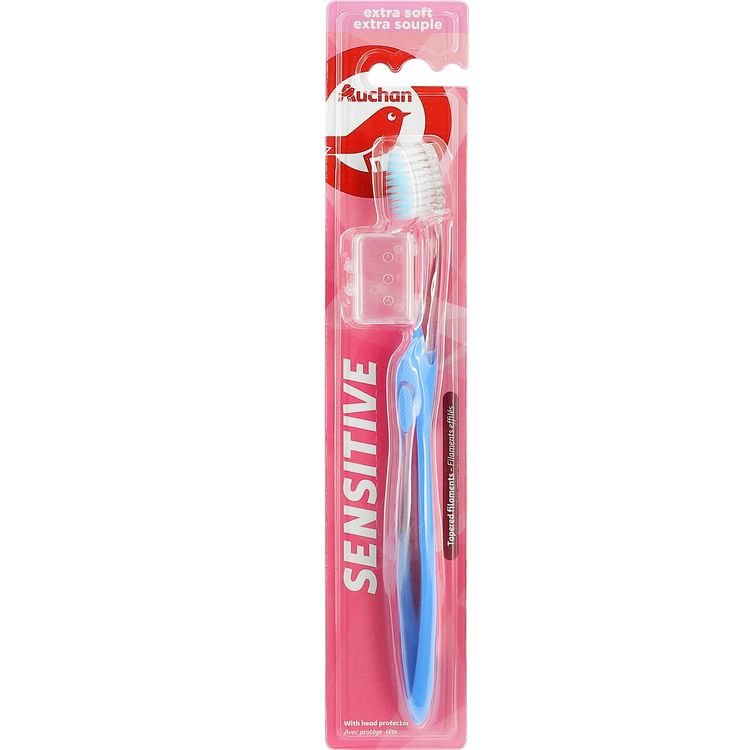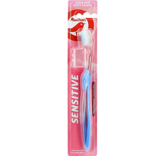 Retrouvez le sourire avec la brosse à dents Sensitive extra soft AUCHAN. Elle nettoie en douceur les dents et les gencives grâce à ses filaments effilés. Le protège-tête permet de la transporter facilement.