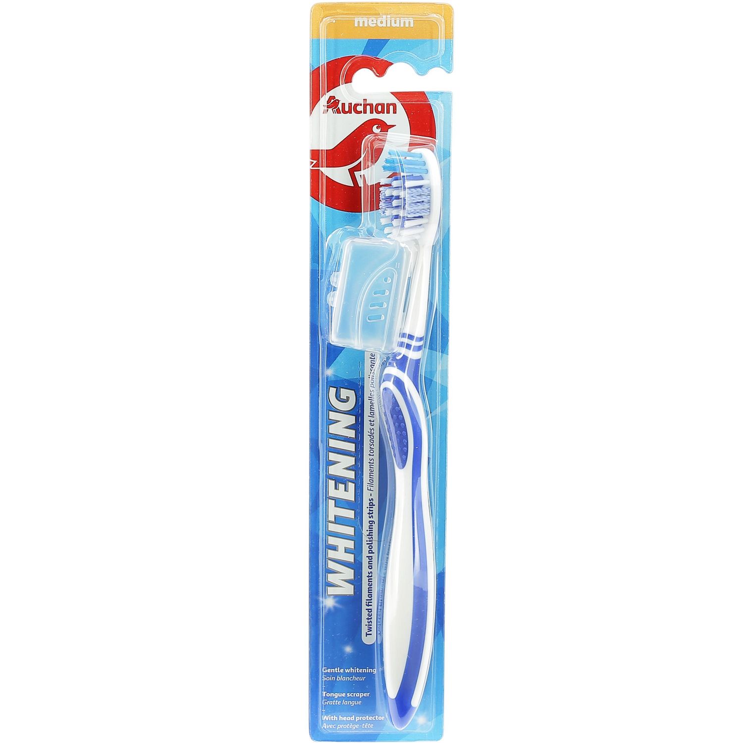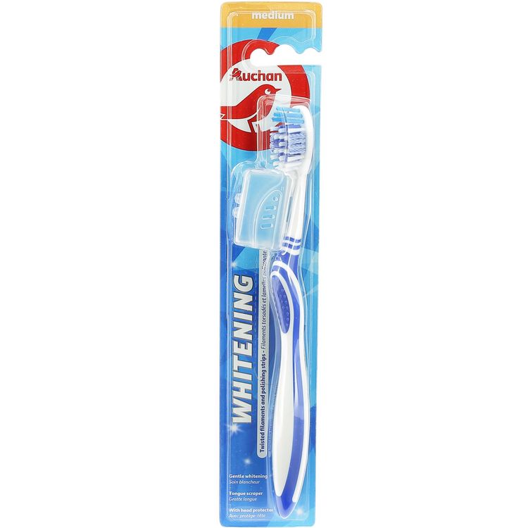 Retrouvez un sourire éclatant avec la brosse à dents Blancheur médium AUCHAN. Elle vous offre un soin blancheur grâce à ses filaments torsadés et ses lamelles polissantes qui aident à enlever les tâches superficielles des dents. Le gratte-langue au dos de la tête permet une hygiène complète de la bouche par son action sur la langue et l'intérieur des joues. Le protège-tête permet de la transporter facilement.