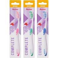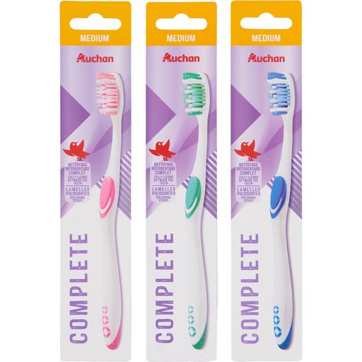 Retrouvez le sourire avec la brosse à dents complète médium AUCHAN. Elle vous offre un nettoyage complet et efficace des dents et des espaces interdentaires, grâce à ses filaments effilés et à ses lamelles polissantes. Le gratte-langue au dos de la tête permet une hygiène complète de la bouche par son action sur la langue et l'intérieur des joues. Le protège-tête permet de la transporter facilement.